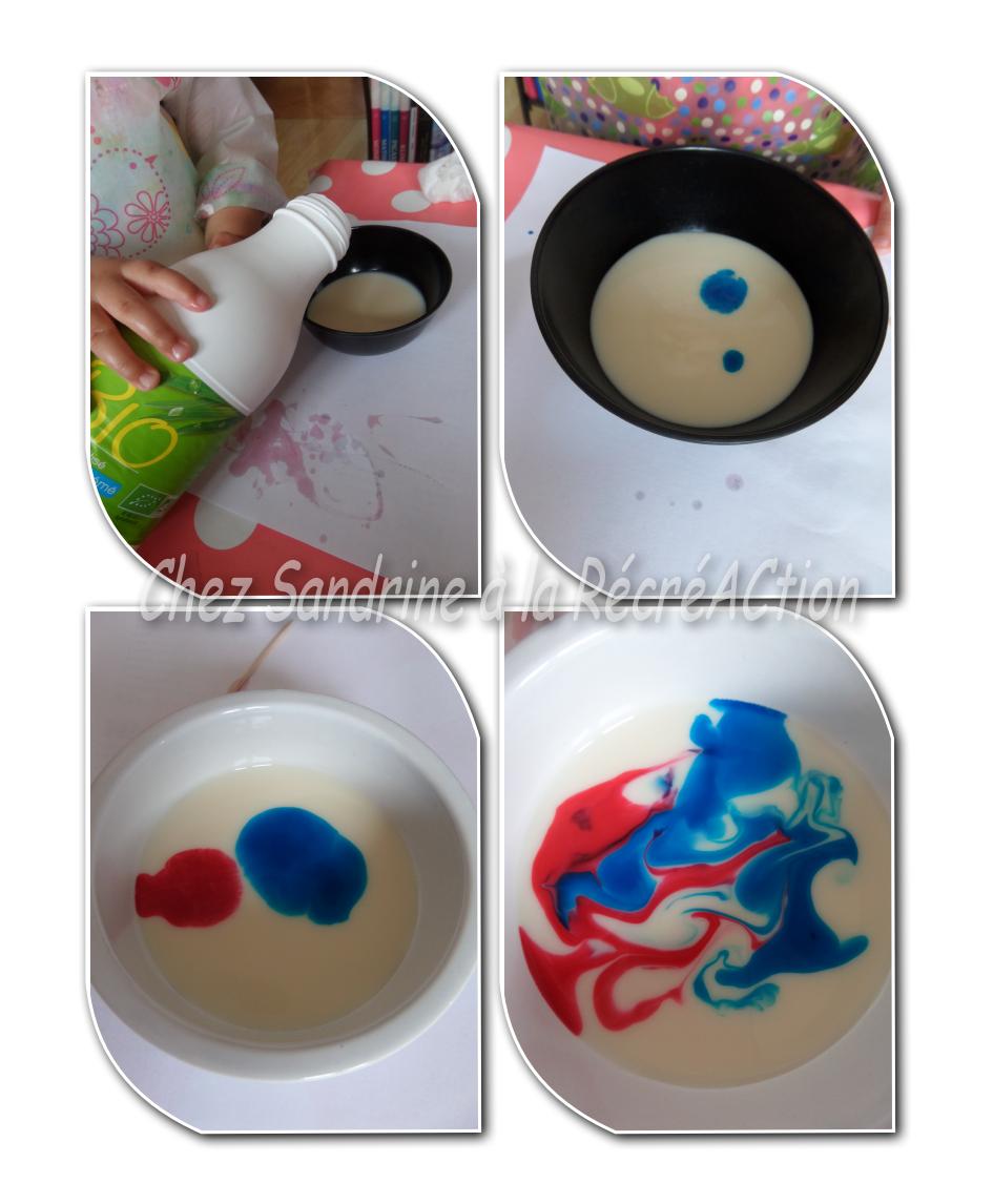 Cette fois je propose aux enfants de mélanger le lait à des colorants alimentaires.